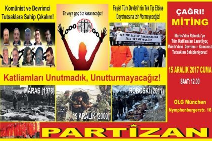 Früher oder Später! Wir werden Siegen! Kundgebung: 15.12.2017, 12 Uhr – OLG München, Nymphenburgerstraße 16 Der türkische Staat übt seit seiner Gründung historisch Repression, Massaker und Assimilation aus. Der Monat Dezember steht in dieser Hinsicht in einer wichtigen Stelle. Dieser Monat hat in den Gedanken unserer Völker die unterschiedlichen Nationen und Glauben angehören sowie im…